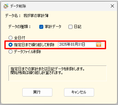 2.データ削除画面で「指定日まで繰り越して削除」を選択し、削除(繰り越し)を行う範囲の最終日を指定します。