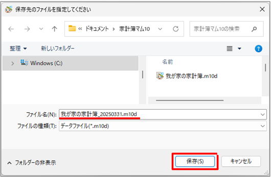 ファイル名の初期値は、[データ名_操作日] です。 (例) 我が家の家計簿_20250331